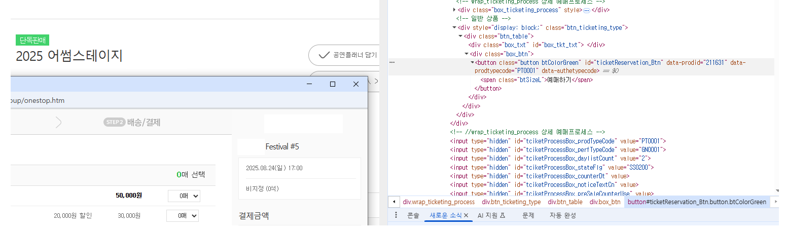 어썸스테이지에서 예매하기 버튼 id를 바꿔 Festival #5를 호출한 모습입니다. 개발자도구에 접근 가능하고, API 호출 방식을 모르는 상태에서는 유의미할 수 있을 것 같긴 하지만 개인적으로는 DOM 조작(클릭이나 이동 등)까지는 유의미하지만, DOM 변경은 무의미하다고 생각합니다. 대부분의 경우 컴퓨터가 사람보다 처리 속도가 빠르니까요.